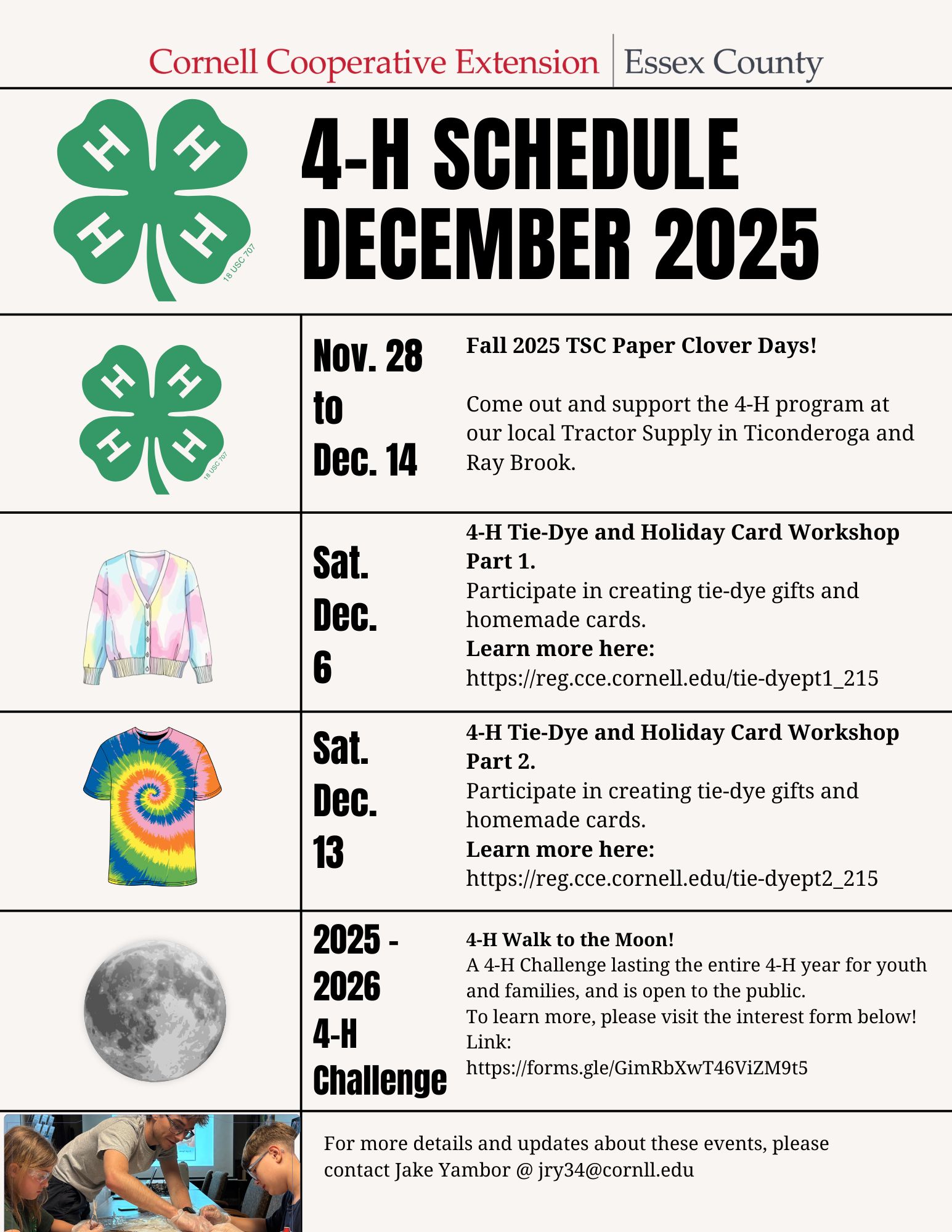 Calendar Flyers and events are released each month before the beginning of the following month. Please take a look at this month's events and reach out to the 4-H Educator if you would like to see a specific activity or event for future months.